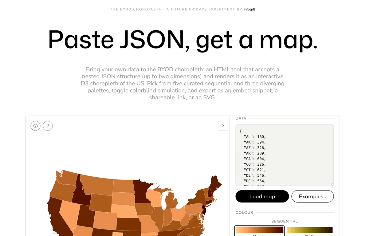 Each Friday we give our team creative license to craft something with utility. One day. One thing that’s useful. This week’s experiment: The Bring Your Own Data (BYOD) Choropleth map tool. Just paste your data, pick a palette, and embed it on your site.